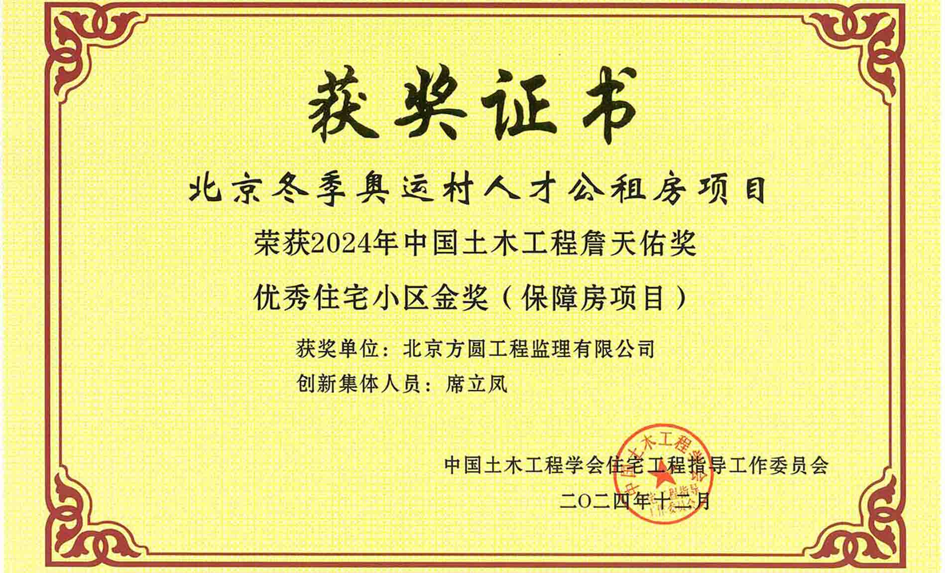 近日,由中國土木工程學(xué)會(huì)評選的2024年度詹天佑獎(jiǎng)揭曉,我公司監(jiān)理的北京冬奧村人才公租房項(xiàng)目榮獲中國土木工程學(xué)會(huì)評選的2024年度詹天佑獎(jiǎng),該項(xiàng)目憑借其卓越的設(shè)計(jì)理念、高標(biāo)準(zhǔn)的施工質(zhì)量以及綠色環(huán)保的創(chuàng)新實(shí)踐,